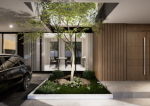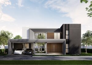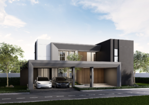 การจัดสรรพื้นที่จอดรถที่ดูเป็นส่วนหนึ่งของตัวบ้าน ทำให้เกิดความต่อเนื่องในการออกแบบ สร้างความรู้สึกโอ่โถงและทันสมัย การเลือกใช้กระจกบานใหญ่ในหลายส่วนของบ้านไม่เพียงแต่ช่วยเพิ่มความโปร่งโล่ง แต่ยังเปิดรับแสงธรรมชาติเข้ามาเติมเต็มภายใน ทำให้บ้านมีชีวิตชีวาตลอดทั้งวัน