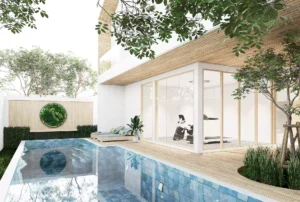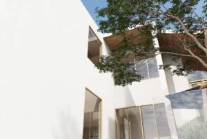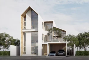 สถาปัตยกรรมของที่อยู่อาศัยแห่งนี้มีความพิเศษด้วย รูปทรงหลังคาทรงจั่วที่สูงโปร่ง ผสมผสานกับเส้นสายที่ทันสมัย สร้างความรู้สึกสง่างามและเป็นเอกลักษณ์ การใช้ กระจกบานใหญ่พิเศษ ตั้งแต่พื้นจรดเพดาน ไม่เพียงแต่ช่วยเปิดรับแสงธรรมชาติได้อย่างเต็มที่ แต่ยังสร้างความรู้สึกโปร่ง โล่ง สบายตา และเชื่อมโยงพื้นที่ภายในกับทิวทัศน์ภายนอกได้อย่างไร้รอยต่อ นอกจากนี้ การเลือกใช้วัสดุอย่าง ไม้สีอ่อน ในส่วนของโครงสร้างหลังคาและบางผนังตัดกับ ผนังสีขาวสะอาดตา เป็นการสร้างความอบอุ่นและความสมดุลให้กับความทันสมัย การจัดวางฟังก์ชันต่างๆ รวมถึงพื้นที่จอดรถที่ออกแบบให้กลมกลืนกับตัวอาคาร และระเบียงส่วนตัวที่มีต้นไม้ช่วยเพิ่มความร่มรื่น ล้วนสะท้อนถึงความใส่ใจในทุกรายละเอียดเพื่อตอบโจทย์การใช้ชีวิตอย่างแท้จริง
