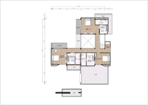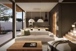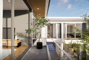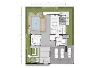 พื้นที่ใช้สอยภายในเน้นความโปร่ง โล่ง และเชื่อมต่อกันอย่างเป็นธรรมชาติ โซนห้องนั่งเล่น ห้องรับประทานอาหาร และมุมพักผ่อนต่าง ๆ ออกแบบให้เปิดรับวิวภายนอกอย่างเต็มที่ โดยเฉพาะสระว่ายน้ำที่ตั้งอยู่ในจุดศูนย์กลางของบ้าน ซึ่งไม่เพียงเพิ่มความสดชื่นให้กับบรรยากาศโดยรวม แต่ยังช่วยเติมความมีชีวิตชีวาให้กับพื้นที่อย่างมีจังหวะ