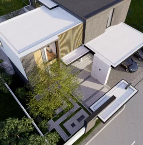 จุดเด่นของบ้านเริ่มตั้งแต่ ด้านหน้า ที่เน้นเส้นสายสะอาดตาและวัสดุที่เลือกใช้ด้วยความพิถีพิถัน เช่น ผนังสีเทาเข้มให้ความรู้สึกมั่นคง ผสานกับระแนงไม้ที่ช่วยเพิ่มความอบอุ่น และผนังกระจกขนาดใหญ่ที่เปิดรับแสงธรรมชาติเข้าสู่ภายใน ทุกองค์ประกอบถูกออกแบบเพื่อให้ทำงานร่วมกันอย่างลงตัว ทั้งในแง่ความสวยงามและประสิทธิภาพในการอยู่อาศัย